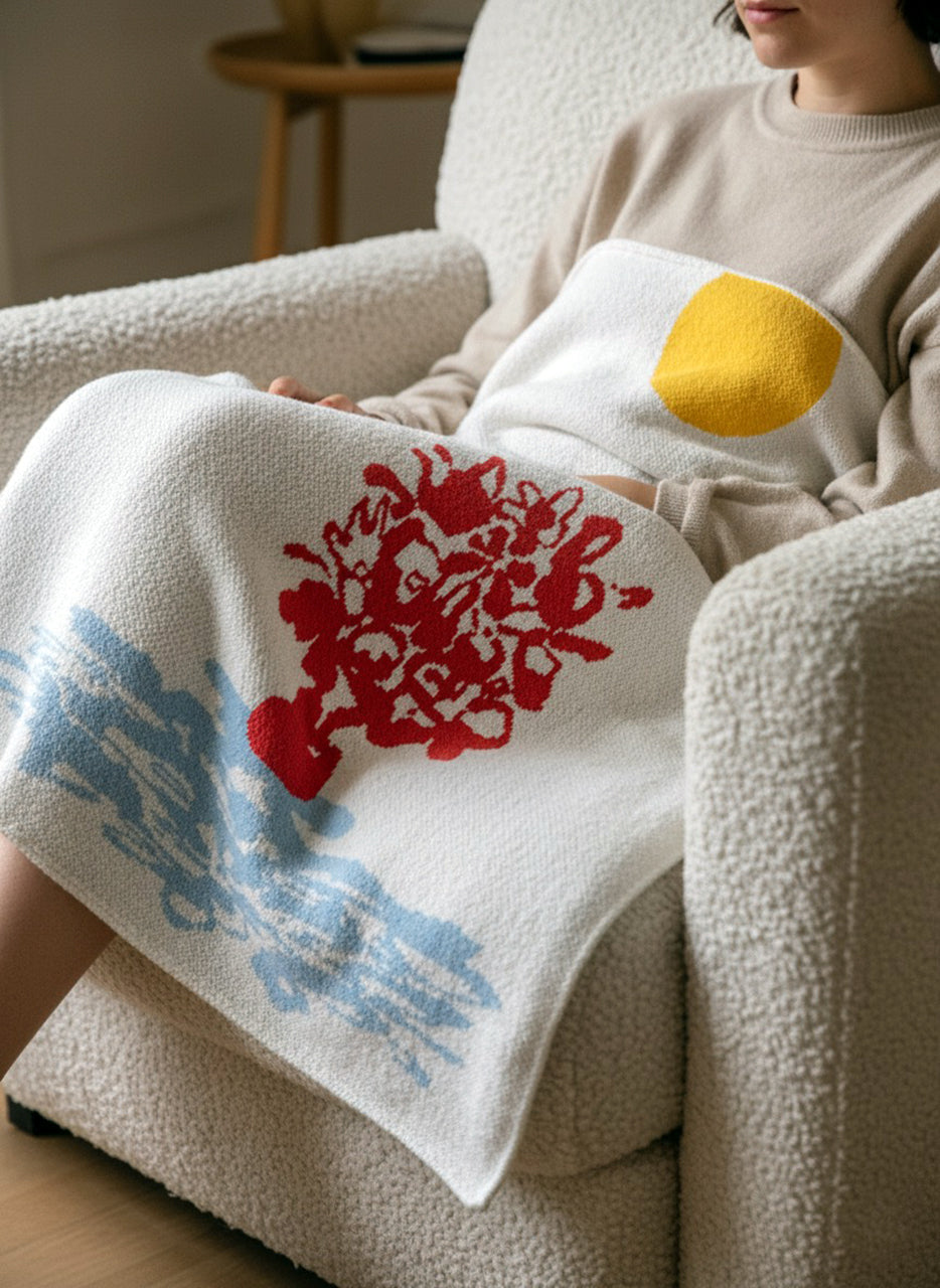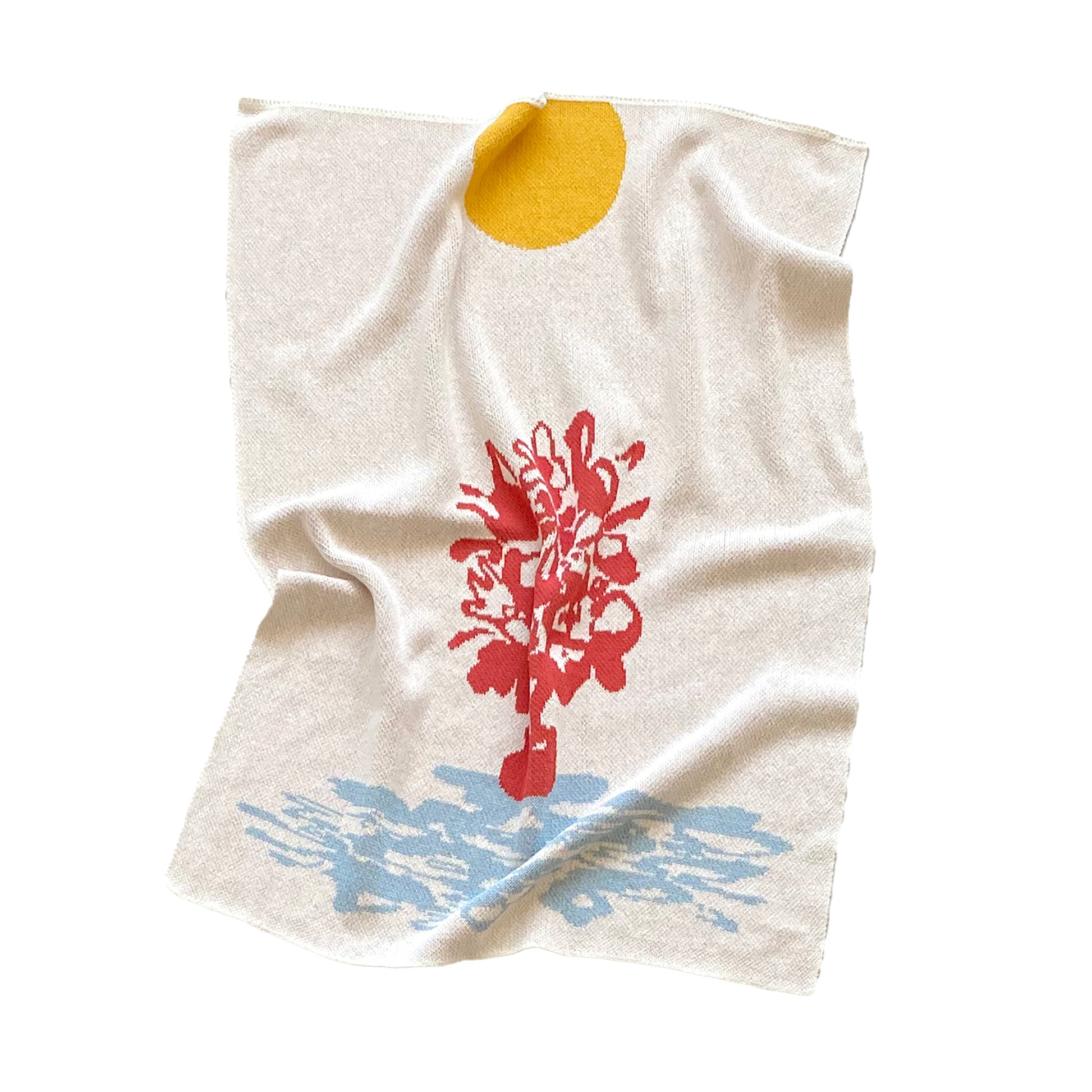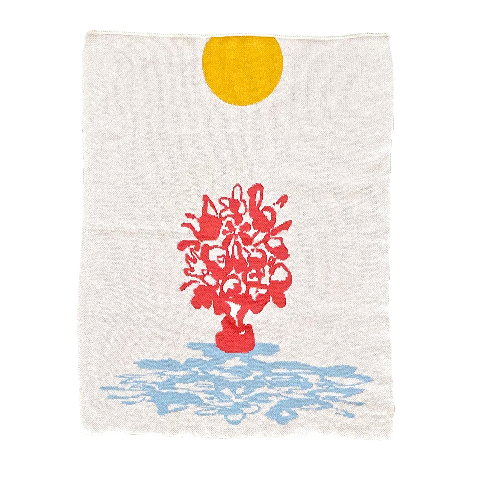 Lovely Day is a modern lap blanket incorporating a Bauhaus-inspired color palette into a charming tableau. A simple round sun shines above a loosely gathered bouquet of flowers and a shadow pools below.